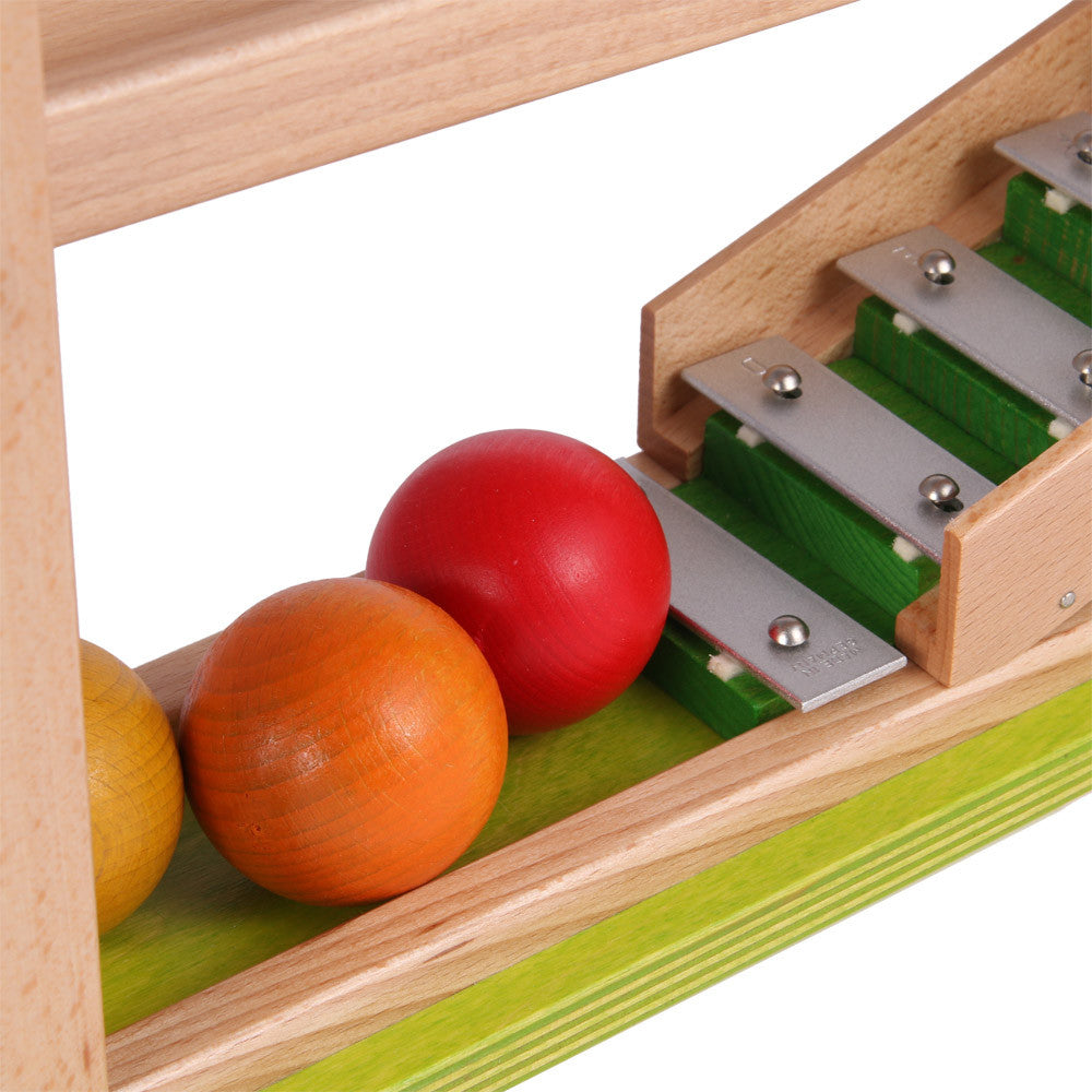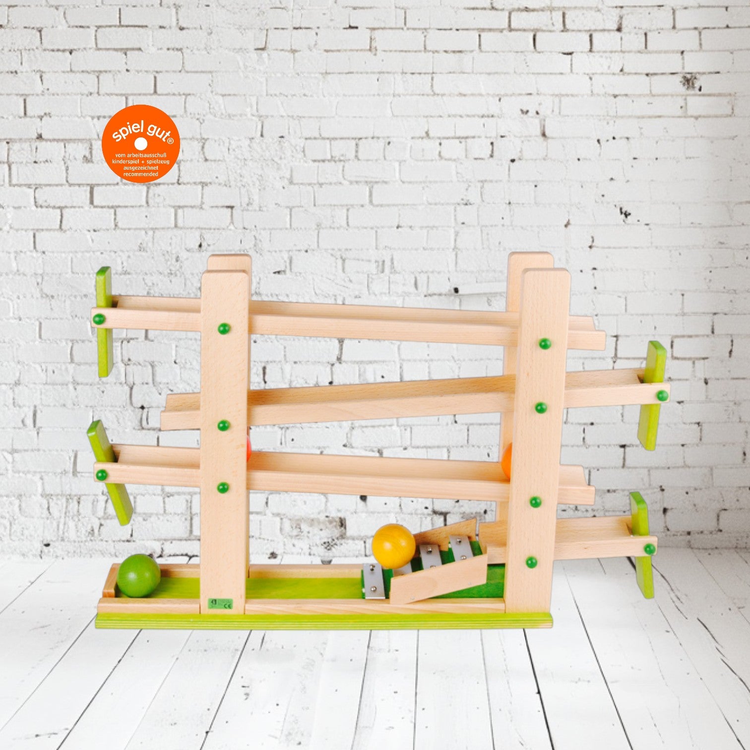 Die lebendigen Farben und die fröhlichen Klänge werden die Neugier der Kleinen wecken. Kinder werden gebannt zusehen, wie die Kugeln die Bahn entlang rollen und die Klappen aktivieren, um am Ende den Klang des Glockenspiels zu erzeugen. Diese Kombination aus Bewegung und Musik macht die Holzkugelbahn sicherlich zu einem neuen Lieblingsspielzeug und fördert gleichzeitig die motorischen Fähigkeiten und die Hand-Auge-Koordination.