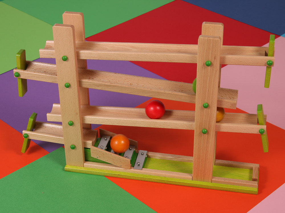 Die Klappen-Kugelbahn ist speziell für die kleinen Hände von Kleinkindern entworfen. Dank der größeren und langlebigen Holzkugeln können schon die Jüngsten sicher spielen. Die bunten Kugeln sausen auf drei stabilen Schienen aus Birkensperrholz hinunter und erzeugen dabei ein faszinierendes Spielerlebnis. Die hochwertige Verarbeitung aus naturbelassenem Buchenholz sorgt dafür, dass diese Kugelbahn nicht nur schön anzusehen ist, sondern auch robust und langlebig.