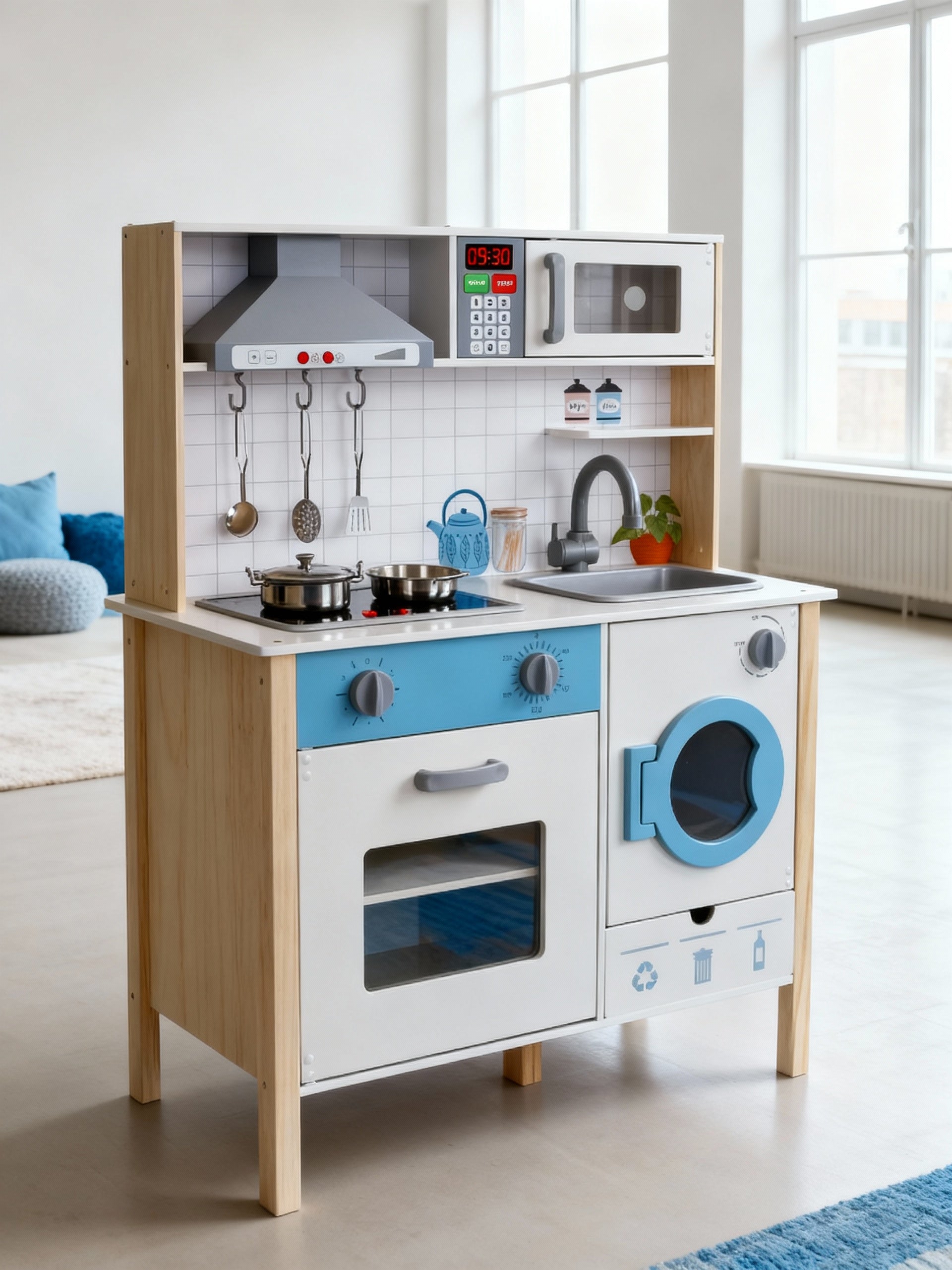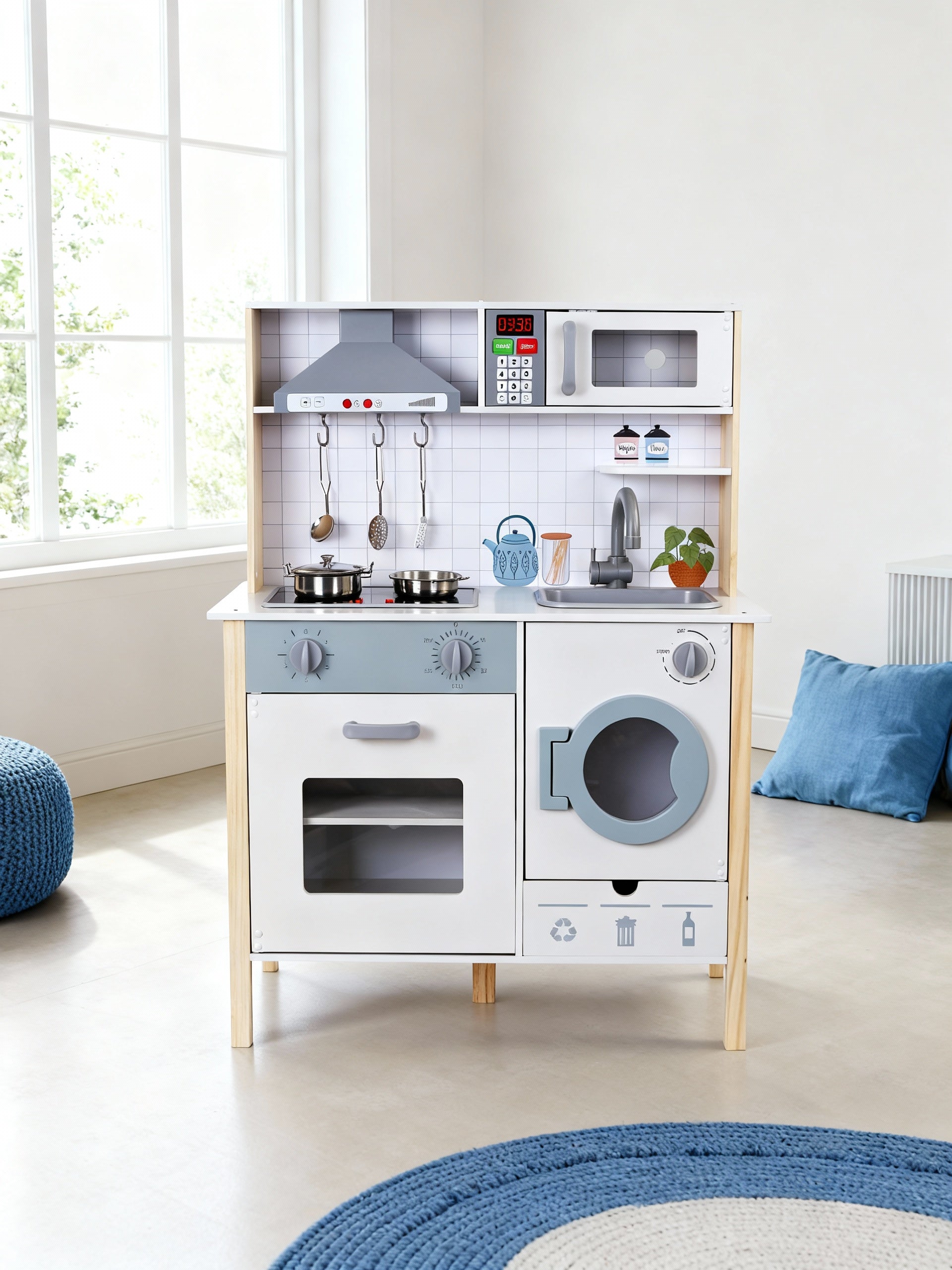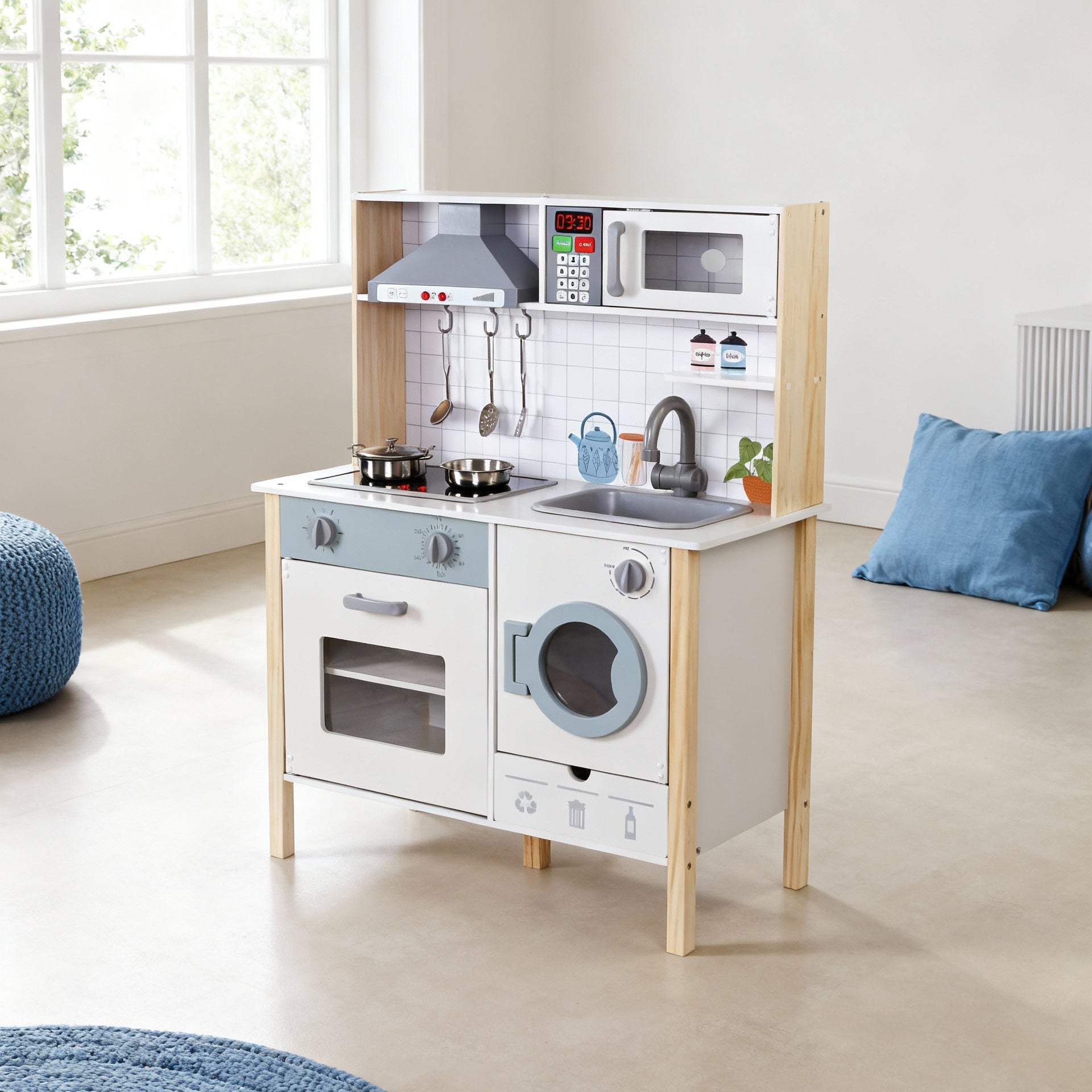 Realistisches Spielerlebnis: Mit Herd, Backofen, Spüle, Waschmaschine, Mikrowelle, Dunstabzugshaube und LED-Beleuchtung.