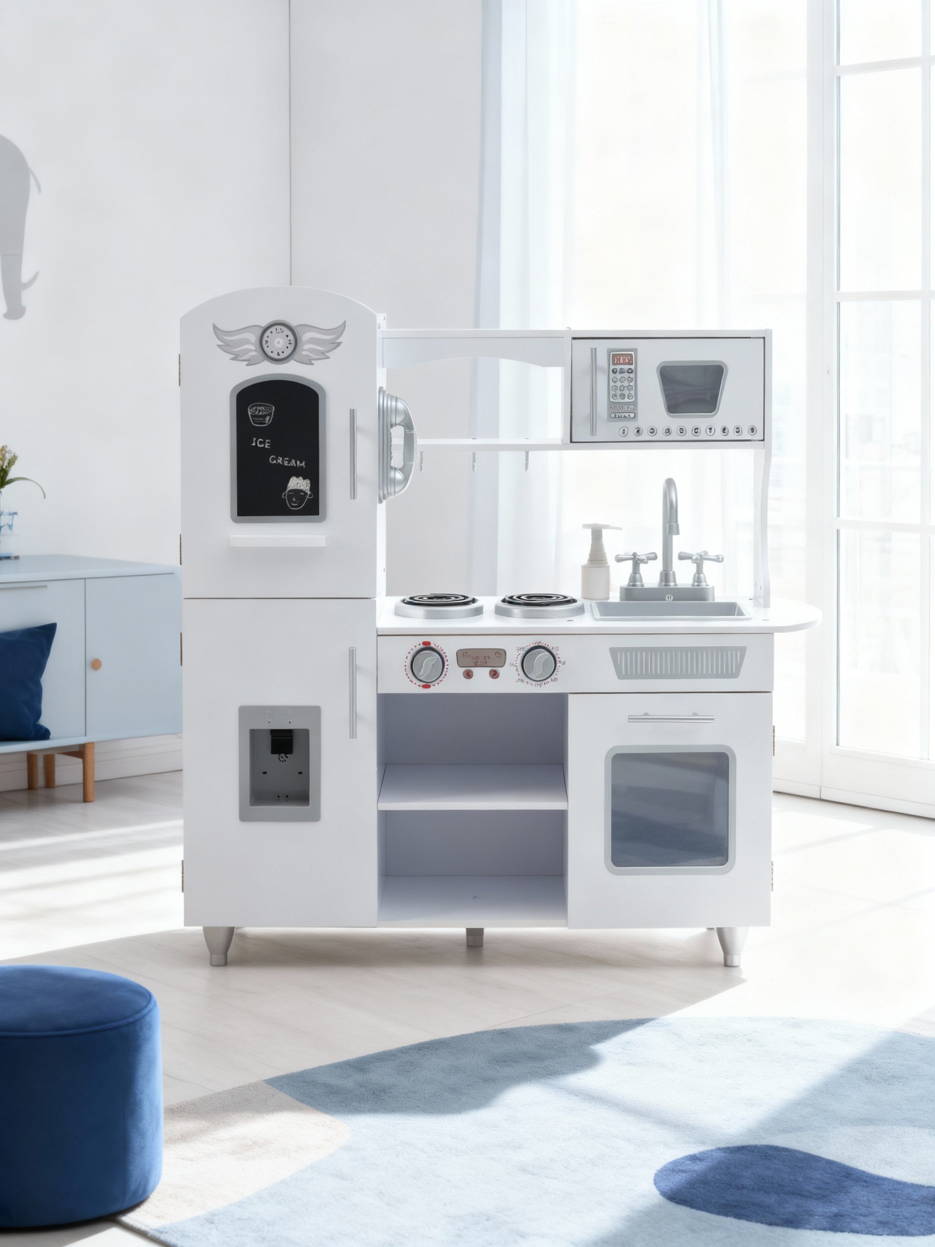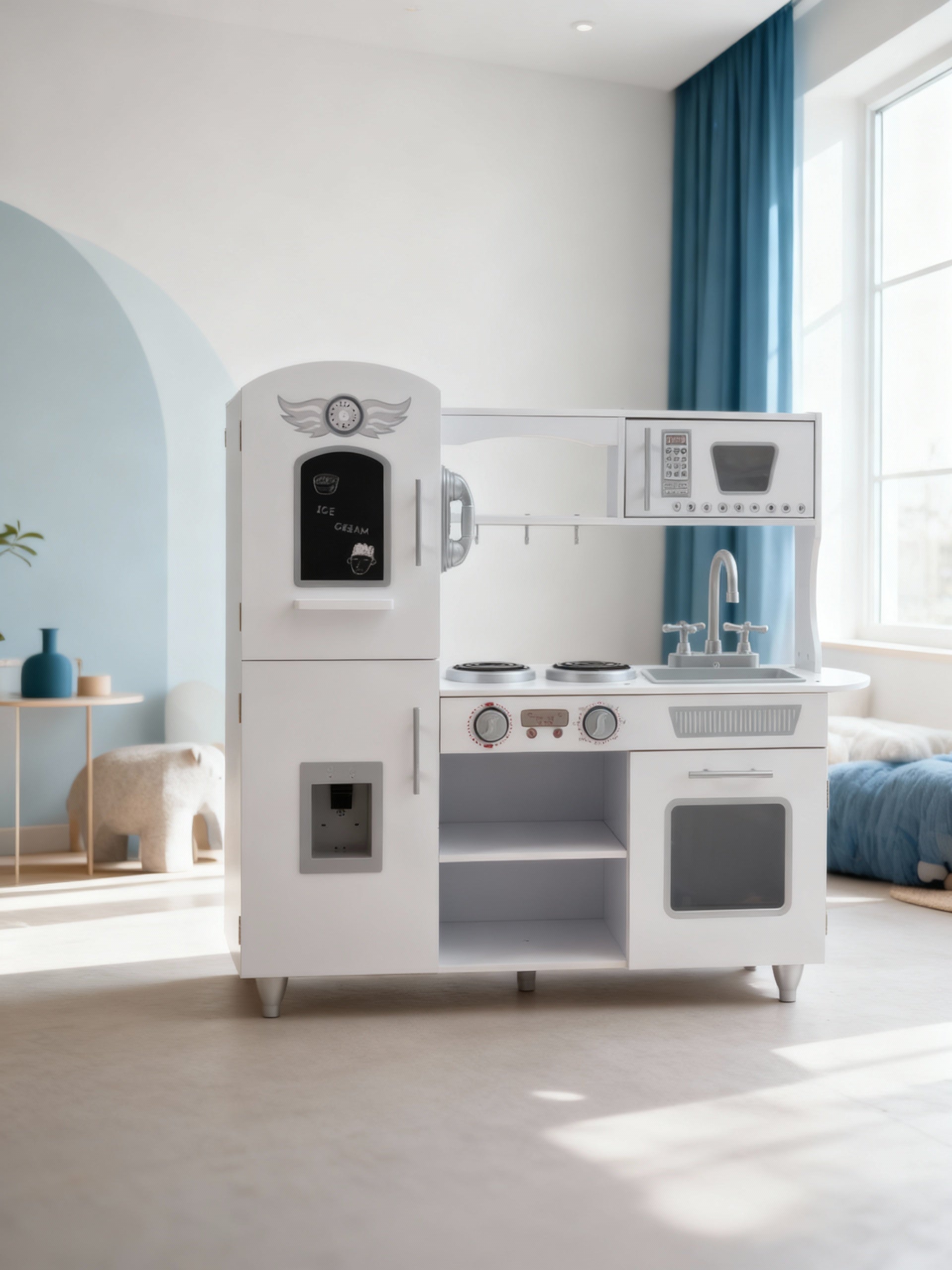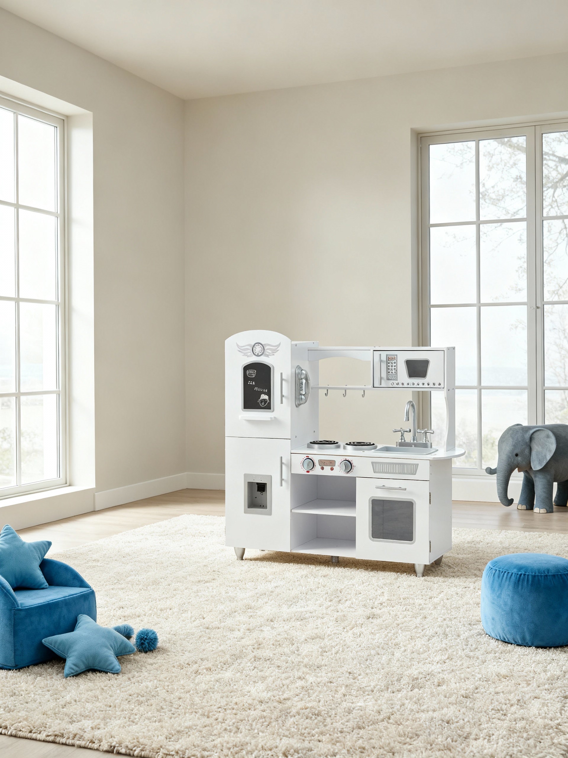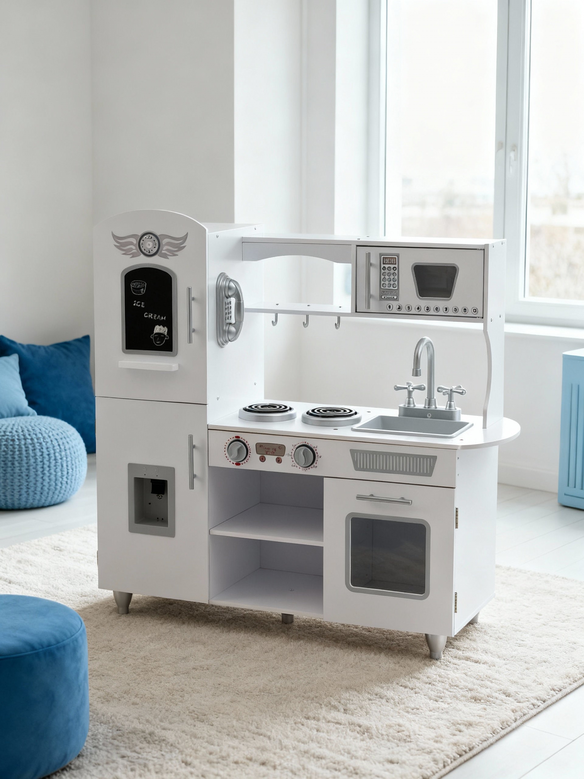 Die Kombination aus Realismus und Fantasie macht diese Küche zu einem Highlight im Kinderzimmer. Kinder können eigene Rezepte erfinden, spielerisch kochen und dabei motorische Fähigkeiten, Organisation und Kommunikation verbessern. Das helle, freundliche Design sorgt für eine gemütliche Atmosphäre und bleibt über viele Jahre ein Lieblingsstück.