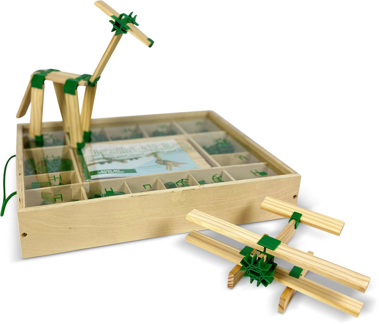 Clips schaffen stabile 3D-Konstruktionen und kommen in hochwertigen Holzkisten.