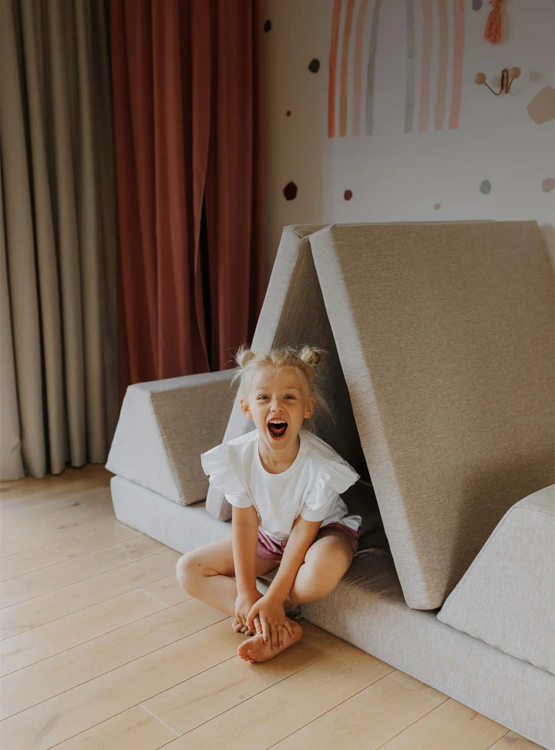 Das Monboxy Sofa ist weit mehr als ein Möbelstück. Es ist Rückzugsort, Bewegungslandschaft, Spielgerät und Ruhezone zugleich. Mal wird es zur Höhle, mal zum Kletterparcours, mal zum gemütlichen Leseplatz. Kinder entscheiden selbst, wie sie es nutzen – und genau darin liegt seine Stärke.