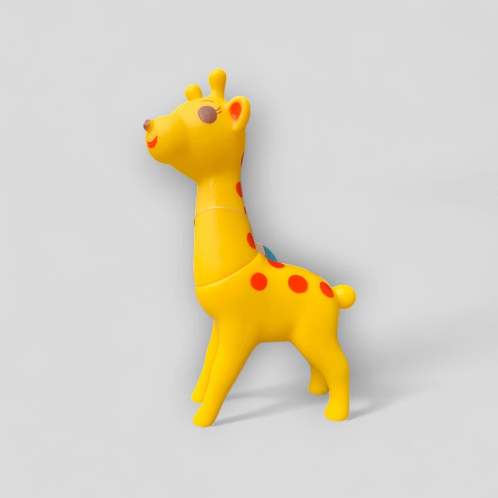 Diese Figur ist aus weichem Vinyl (PVC, phthalatfrei) gefertigt, ca. 14 cm hoch und 5,7 cm breit. Auf dem Bauch ist JAPAN eingeprägt, und das Etikett bestätigt die Herstellung in Japan. Die Giraffe hat braune Augen und Nase sowie einen drehbaren Kopf.