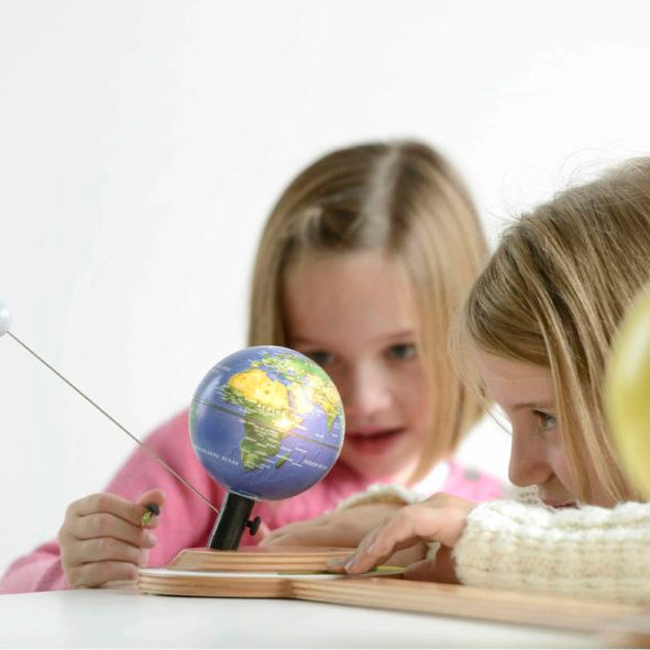Eine integrierte Taschenlampe, die als Lichtquelle in die Sonne eingesetzt wird, simuliert realistisch den Sonnenschein. So können Licht- und Schattenverhältnisse unmittelbar beobachtet werden. Eine kleine Kunststofffigur, die am Äquator befestigt wird, unterstützt bei der Erklärung von Tageszeiten und Himmelsrichtungen – etwa bei Fragen wie: