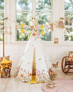 Das Tipi „Wildflowers“ weist ein Muster auf, das in Zusammenarbeit mit der Illustratorin Kasia Goraj-Stróżyńska erstellt wurde. Es wurde von einer Wiese im Sommer und Urlaubsabenteuern inspiriert, während Reh und Bienen eine idyllische Atmosphäre schaffen.