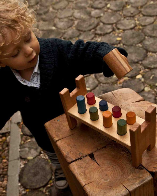 Die Klopfbank von Wooden Story bringt generationsübergreifenden Spielspaß zurück in moderne Kinderzimmer – nachhaltig gedacht, farbenfroh gestaltet und wunderbar robust. Mit dem passenden Holzhammer klopfen Kinder acht bunte Holzstifte durch den Rahmen – und sobald alle durch sind, wird das Spielzeug einfach umgedreht und das Spiel beginnt von vorn. Ganz nebenbei fördert es die Hand-Auge-Koordination, Konzentration, Farbverständnis und die Freude am eigenen Tun.