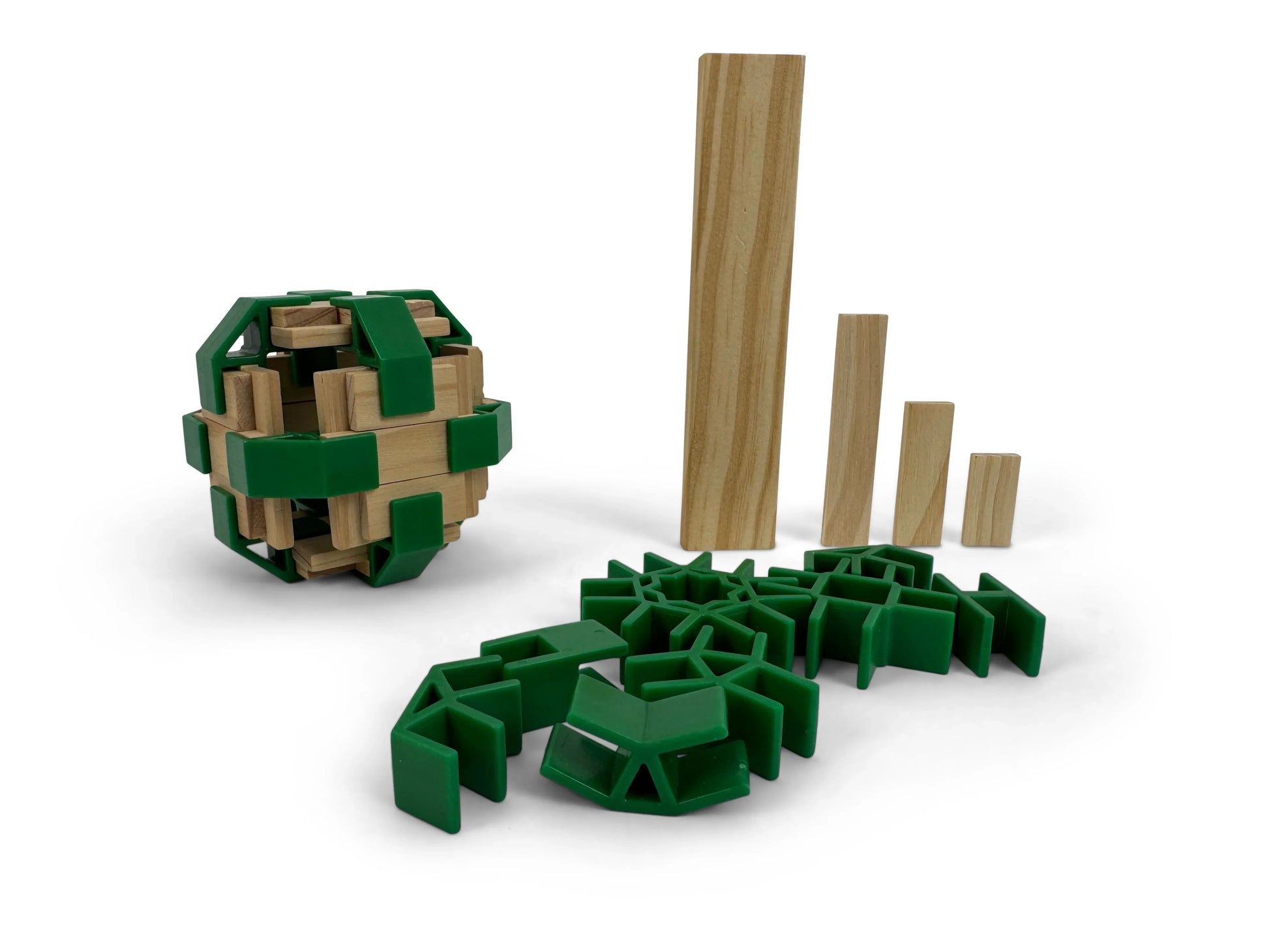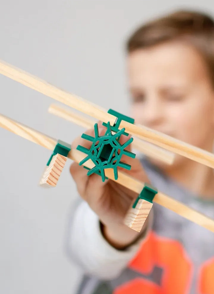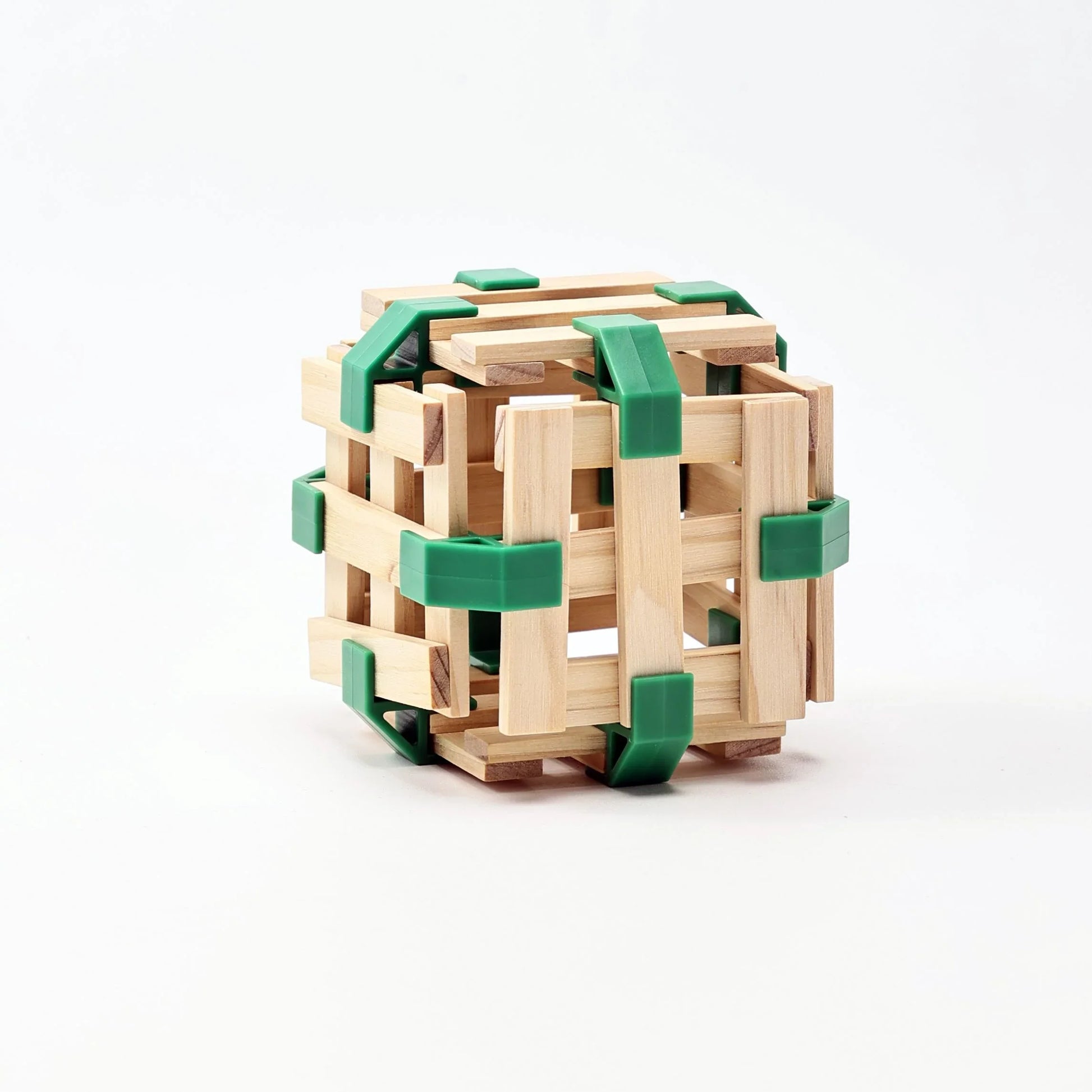 Clips schaffen stabile 3D-Konstruktionen und kommen in hochwertigen Holzkisten.